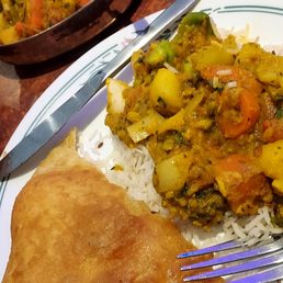 No buffet on Sundays, but they cooked us dishes to order off the menu. I tried a different kind of bread than our usual naan; this one is fried. Look out! There's a big jump in spiciness from mild (no curry) to medium. I found the mild flavorful enough, but my husband rued his decision to order medium. The entrees are large enough that we each took home half for lunch the next day, making the prices a steal. (He did have to add sugar to make his palatable.) Service was fine. We had the place to ourselves to watch the Indian music videos on the TV screen.